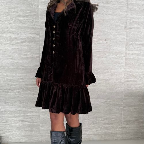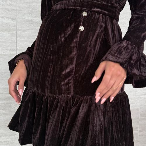 A soft velvet dress featuring a chic ruffle hem and a fixed 38-inch length for an elegant, effortless look.