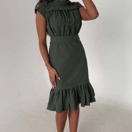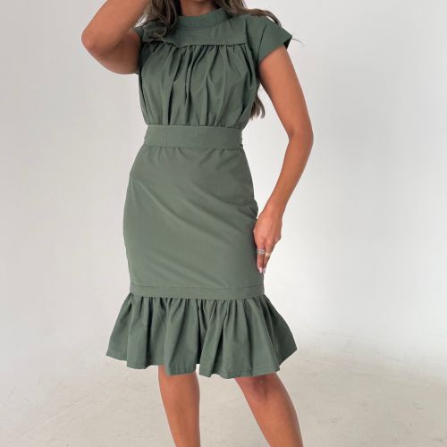 An elegant dress with a defined waist, soft gathered detailing at the bodice, and a ruffled hem for a refined feminine look with effortless charm. 38 inch