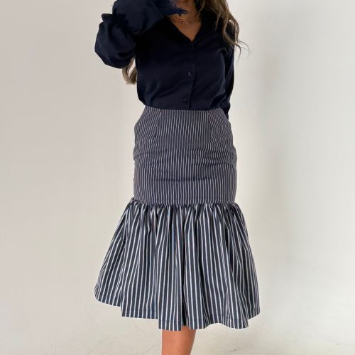 An elegant two-piece set featuring a black blouse with delicate lace sleeves, paired with a striped midi skirt fitted at the top and flared at the hem for a refined modern feminine look. Length is 26inch